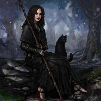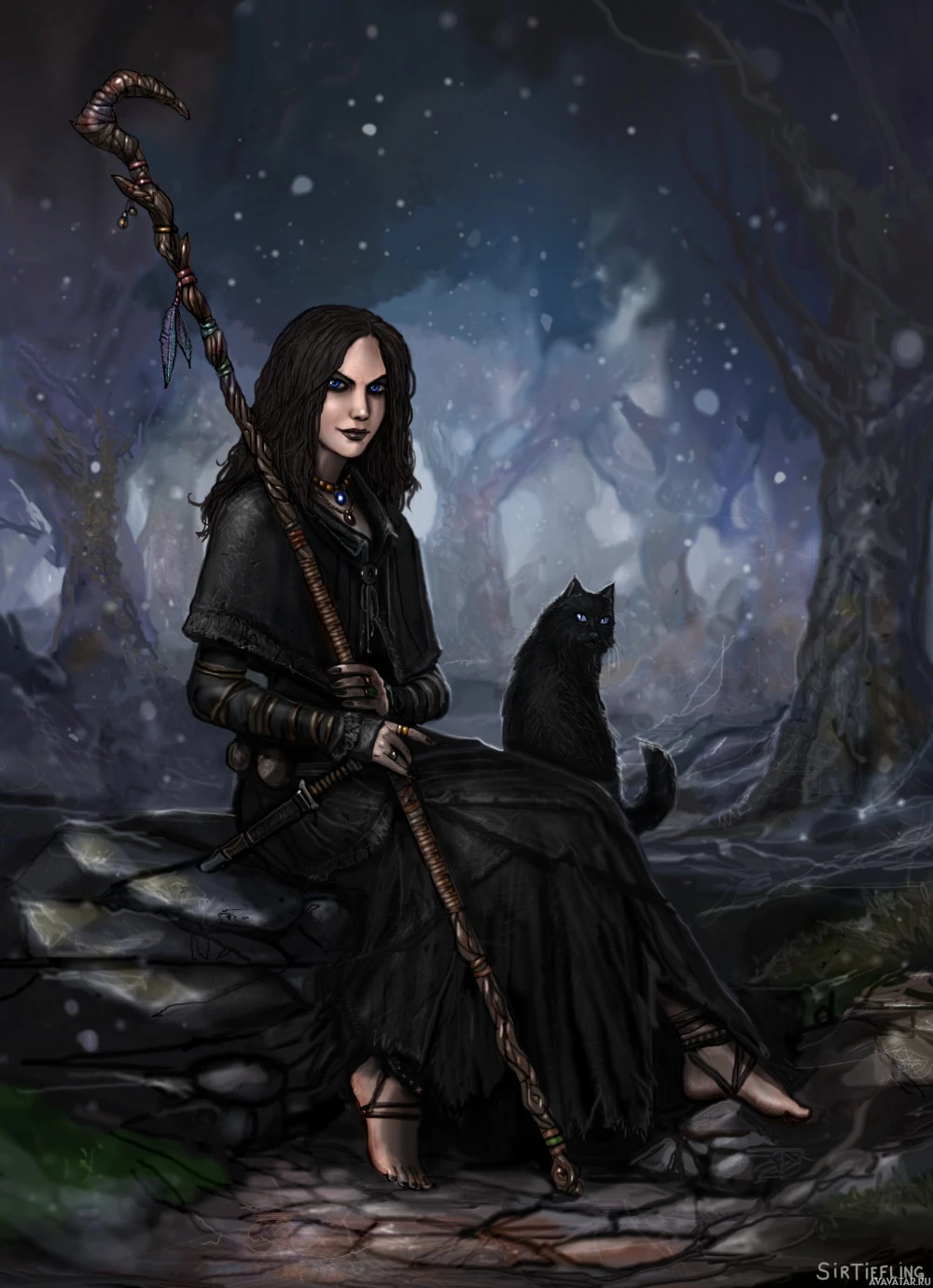 an ethereal look about her and is holding a staff that resembles a wand. Accompanying her is
