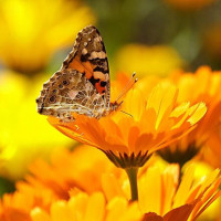 black coloration, which is characteristic of many butterflies found in nature. The flowers are vibrant and orange, possibly marigolds or similar
