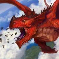 The image depicts a fantasy-style dragon soaring through the sky. The dragon is red and appears to be roaring or shouting with its mouth open, perhaps in anger or as part of its