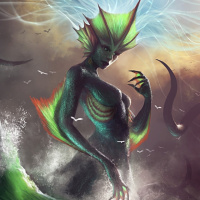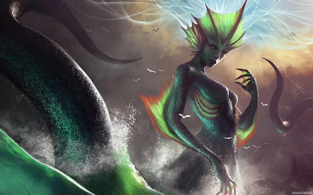 The image depicts a fantasy-themed scene with a character that appears to be a mermaid. The mermaid has the upper