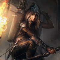 На картинке изображен женский персонаж с длинными волосами, одетый в плащ с капюшоном и держащий лук. Она приседает на палубе корабля или лодки, о чем свидетельствуют деревянные доски и наличие огня, горящего поблизости. Стиль предполагает, что она может быть лучником или рейнджером из фэнтезийной обстановки или игры.