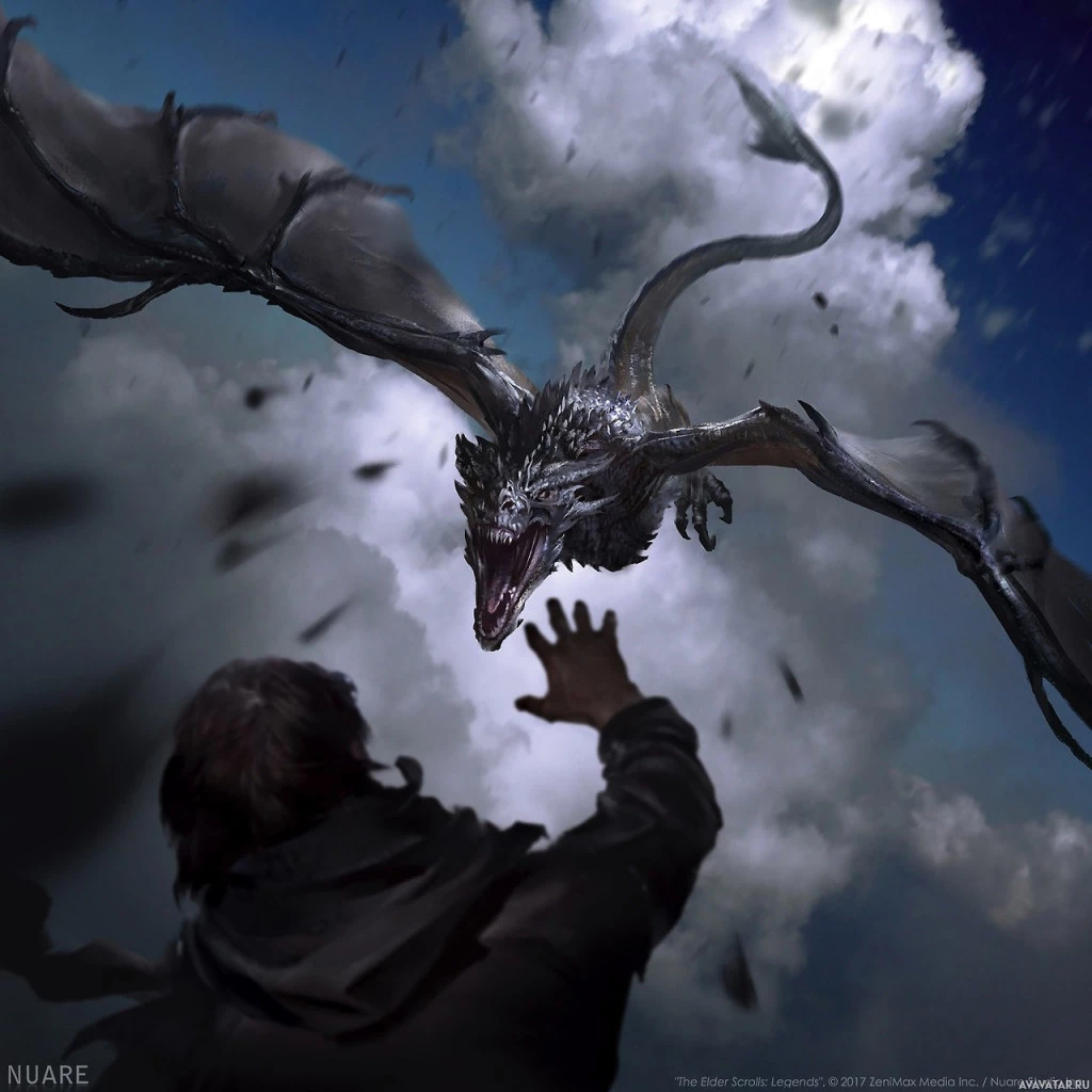 a fantasy scene with a person reaching out towards a dragon. The dragon is large, with wings spread wide and