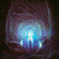 celestial body above the person, creating an ethereal effect in contrast to the dark surroundings.