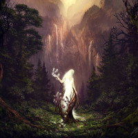 a fantasy scene with a mythical creature that appears to be a combination of human and deer, possibly a faerie or a similar being from folklore. This creature stands in the center of