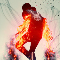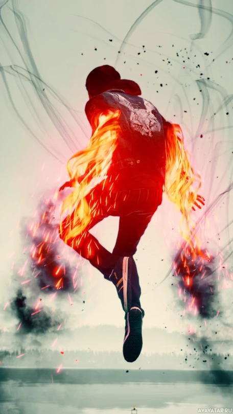 The image depicts a person from behind, appearing to jump or perform an action that is causing their clothes to catch fire. The individual seems to be in motion with their arms spread out, as if they are trying to fan the flames away from themselves. The background has a gritty and