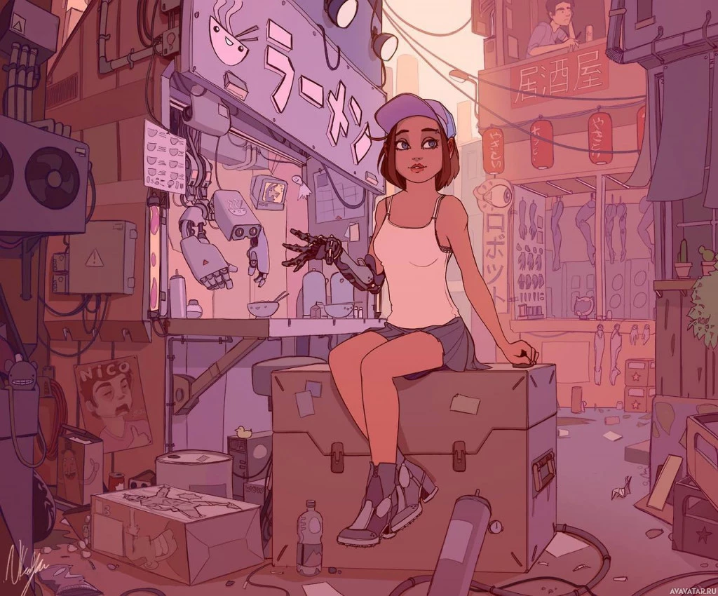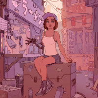 a female character in an urban futuristic setting. She is sitting on what appears to be a stack of boxes or crates, wearing