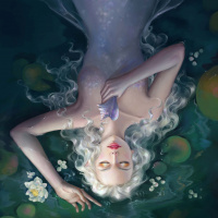 white hair lying on the water's surface, seemingly in a state of relaxation or rest. She has her eyes closed and is holding what appears to be a seashell close to her chest. Her