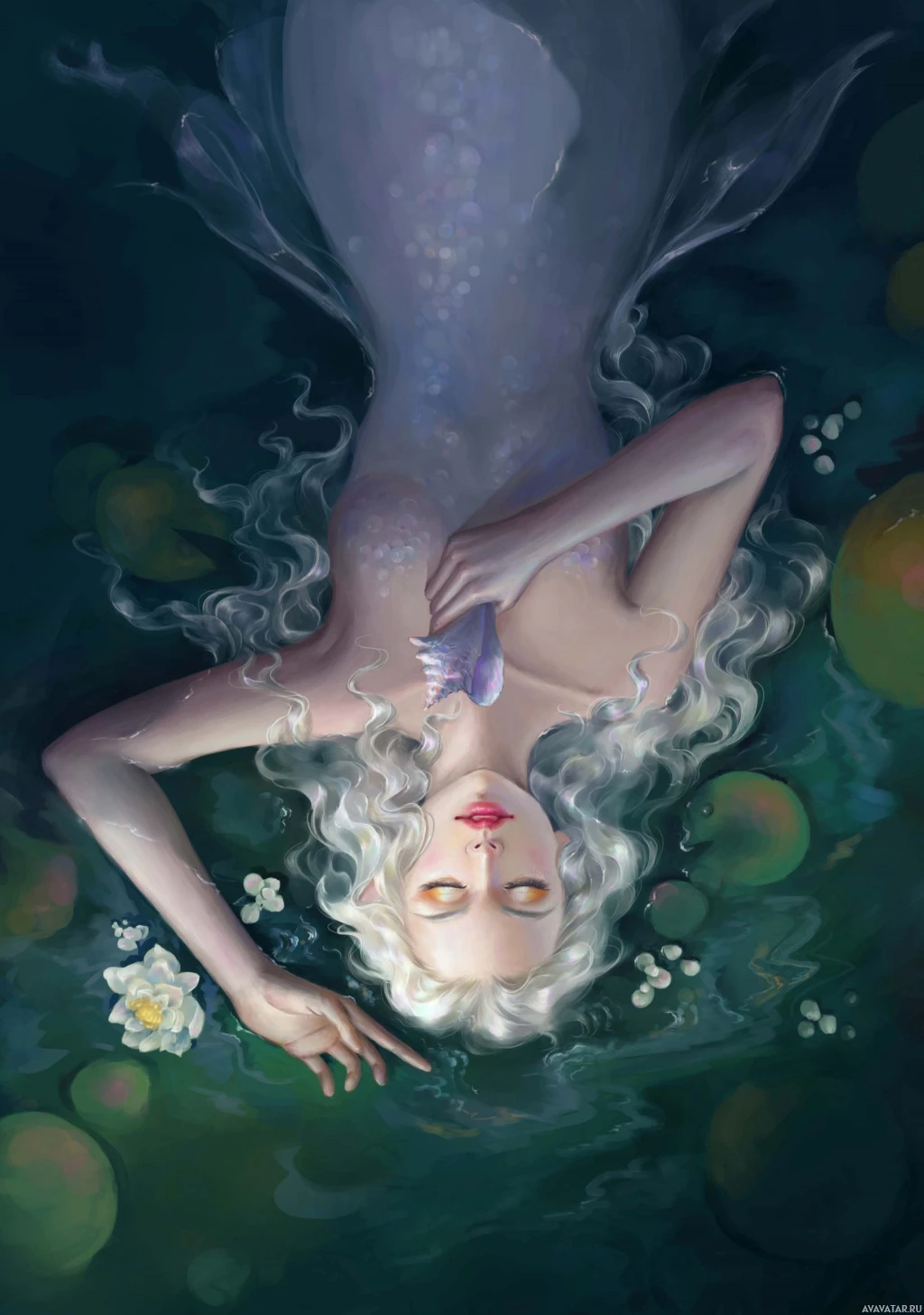 surrounding environment suggests a serene underwater setting with lily pads and bubbles around her. This image is likely part of a fantasy theme, as