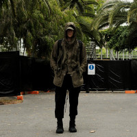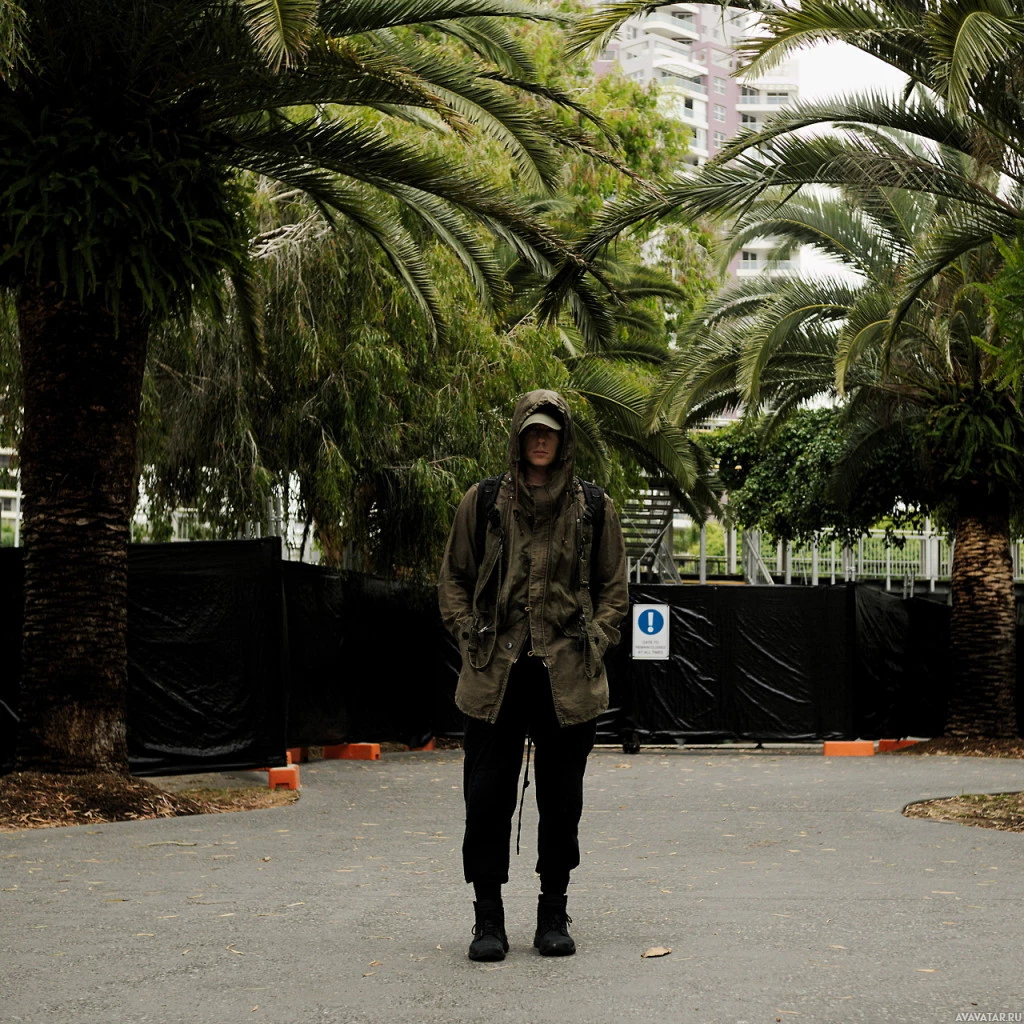 a hooded jacket, possibly with a dark-colored hood pulled up over their head. They are looking away from the camera and seem to be observing something in the distance. The person has a backpack slung over one shoulder, suggesting they might be a traveler or commuter. The setting looks like it could be an urban park or