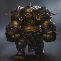 the fantasy genre. This creature is typically depicted as a large, muscular humanoid with features such as horns and tusks, often associated with strength and brutality in