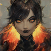 a dark top with flame designs and a cape that seems to incorporate elements of fire, enhancing her fiery appearance. The character's expression is serious, and the overall tone of the image is dark and dramatic.