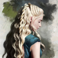 blonde hair and is wearing traditional clothing that resembles the style from her native land of Westeros. The artwork captures her profile, with