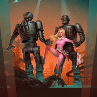 The image features a female character with blonde hair, wearing pink attire, standing between two large robots. One robot has its arms outstretched while the other stands with its arms at its sides. The setting appears to be an industrial or post-apocalyptic environment with structures and machinery in the background that suggest a dystopian or sci-fi theme.