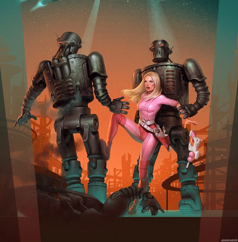 На картинке изображена женщина с светлыми волосами, в розовом наряде, стоящая между двумя большими роботами. У одного робота вытянуты руки, а другой стоит с руками по бокам. Настройка, по-видимому, является промышленной или постапокалиптической средой со структурами и механизмами на заднем плане, которые предлагают антиутопическую или научно-фантастическую тему.