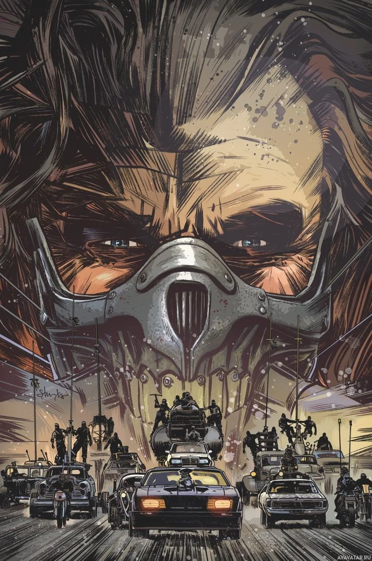 Mad Max. In the center, there's a character that resembles Immortan Joe from the film "Mad Max:
