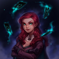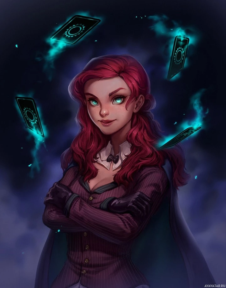 red hair and is wearing what seems to be a dark-colored outfit with a cape, suggesting she may have magical or mystical abilities. In the background, there are floating cards or playing cards that seem to be related to her magic or powers. The overall atmosphere of the image is moody and dark, which might indicate a scene from