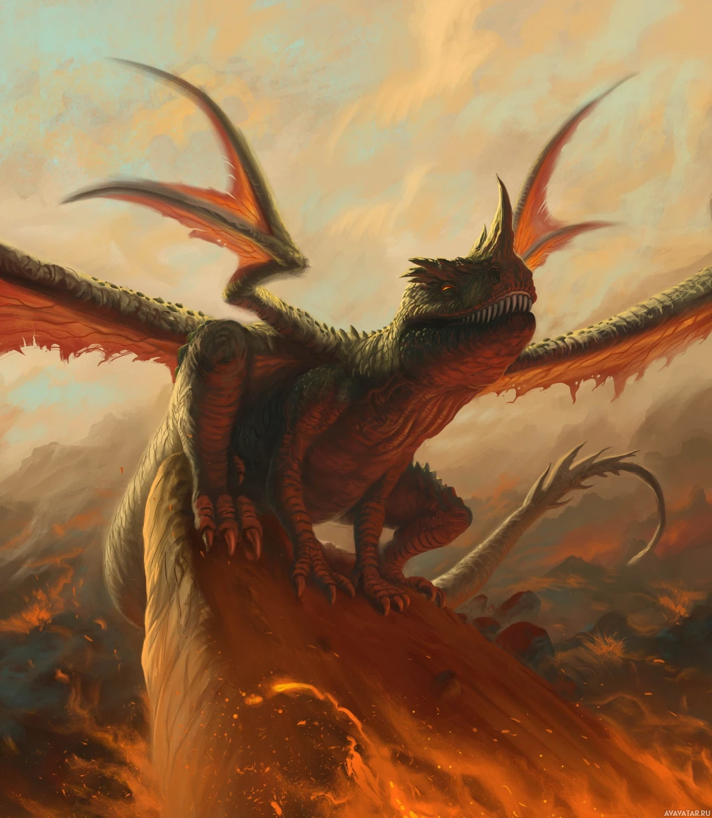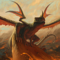 The image shows a fantasy-themed illustration of a dragon. It has large wings,