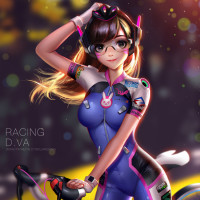 video game series. She is wearing a racing suit with various logos and branding, including that of the fictional