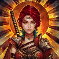 a fiery environment or her being associated with fire elements within her narrative or abilities. The overall aesthetic of the artwork suggests it might be related to fantasy or role-playing genres, where characters often have distinctive visual themes and powers.