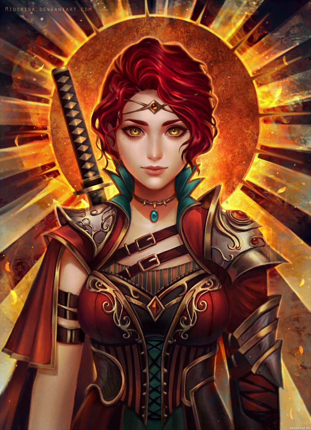 a female character with red hair. She has striking yellow eyes and is wearing armor, suggesting she could be from