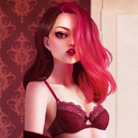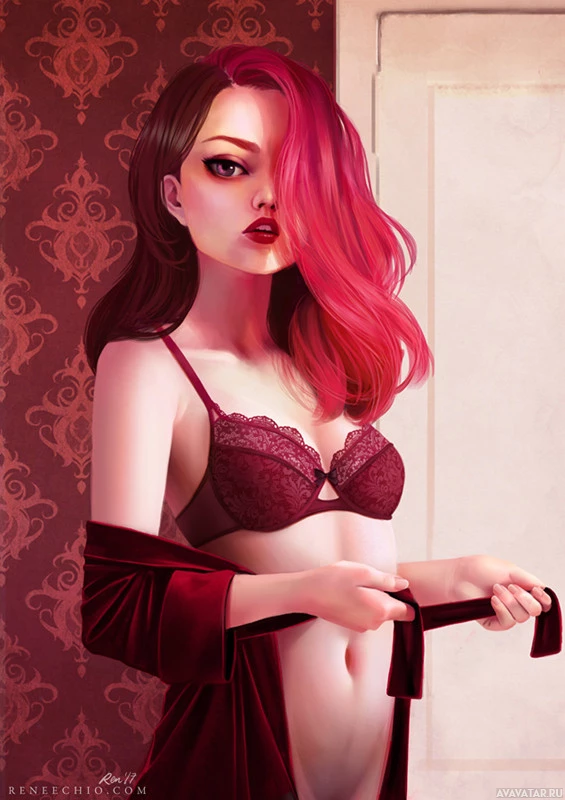 red hair, wearing lingerie and standing in front of a patterned wall. She seems to be looking down at her hands as they are holding what could be a garment or fabric. There is text on the image that says "Rebecca's Choice" and another line of text that reads "© RespectChicken", which likely indicates