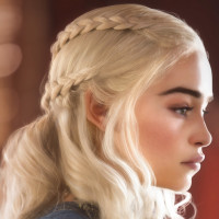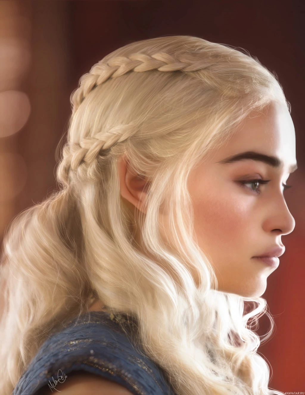 This image features a character from the television series "Game of Thrones." The character is Daenerys Targaryen, played by actress Emilia Clarke. She is known for her portrayal of the strong-willed and determined queen in the fictional land of Westeros. The image captures a moment where she appears to be lost in thought or experiencing a contemplative expression.