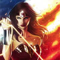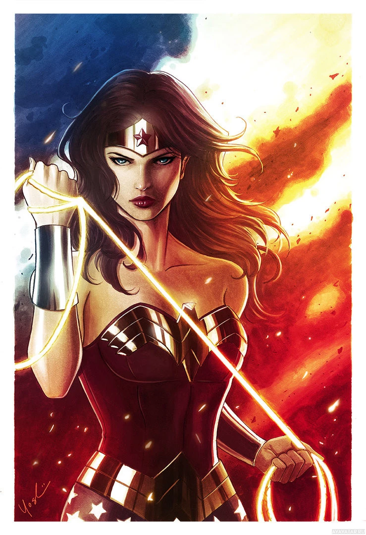 Wonder Woman, depicted in her iconic superhero costume. She is holding