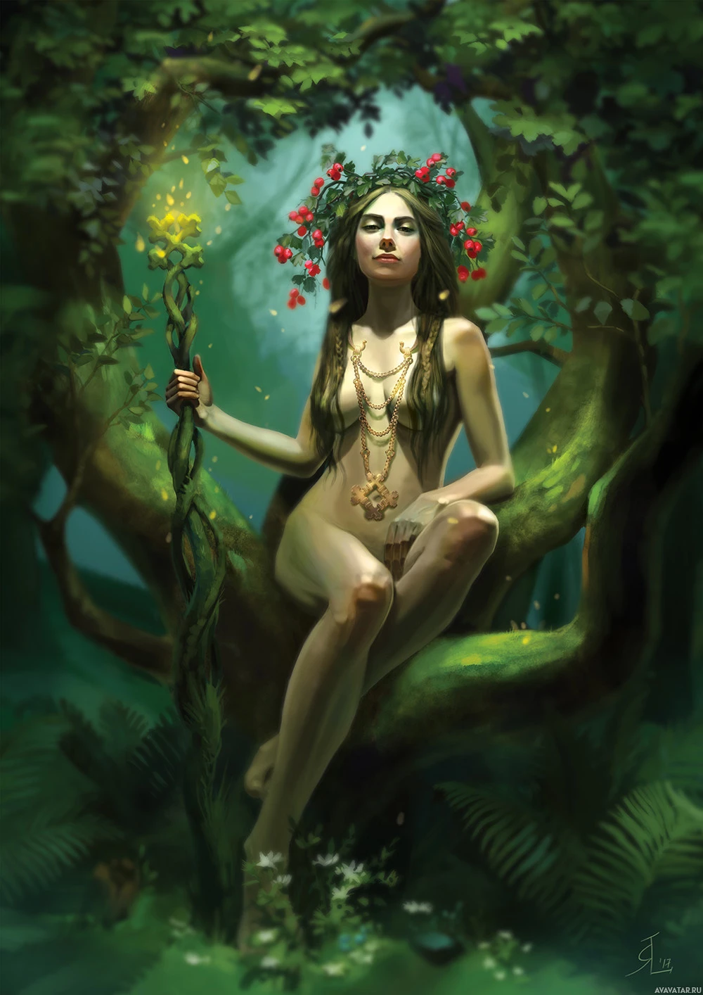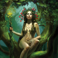female figure sitting on the branches of a tree. She is adorned with greenery and flowers, giving her an appearance reminiscent of a dryad or similar