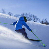 covered slope, likely in the context of cross-country skiing. They are wearing skis with yellow tips and are dressed in winter sports attire that includes a blue top and