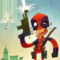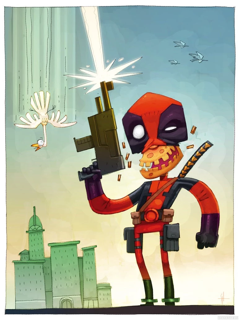 The image features an illustration of the character Deadpool, a popular anti-hero from