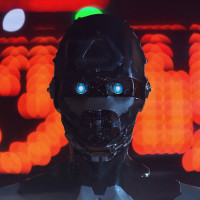 blue eyes, suggesting a high level of sophistication in artificial intelligence or robotics. The background appears to be a brightly lit room with a pattern on the wall that could indicate