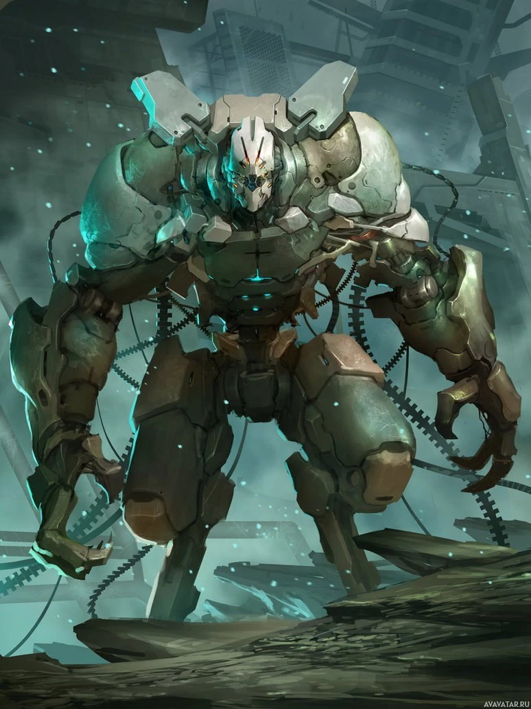 На картинке изображен персонаж робота-фантаста. Он имеет бронированную гуманоидную форму с видимыми механическими частями и светящимися синими компонентами. Робот изображен в несколько угрожающей позе на фоне, который предполагает антиутопическую или промышленную обстановку.