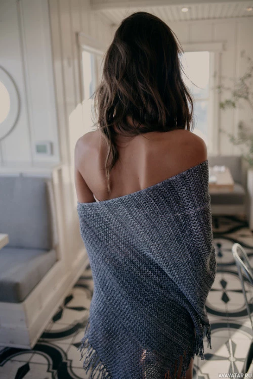 a knitted garment, possibly a shawl or scarf, wrapped around their shoulders. The person has