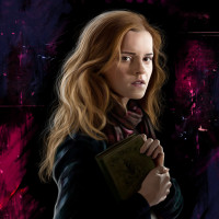 The image features a woman who appears to be portraying the character of Hermione Granger from the "Harry Potter" series. She has long, wavy hair and is wearing a dark jacket with what looks like a scarf around her neck, holding a book in one hand. Her expression is thoughtful or possibly contemplative as she gazes away from the viewer. The artwork has an abstract or textured background that adds a dramatic effect to the portrait.