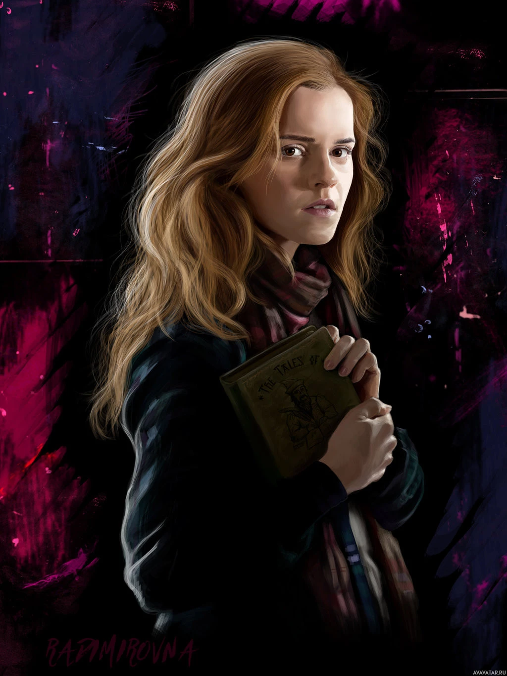На картинке изображена женщина, которая, похоже, изображает героиню Гермионы Грейнджер из серии «Гарри Поттер». У нее длинные волнистые волосы и она носит темную куртку с шарфом на шее, держа книгу в одной руке. Ее выражение вдумчиво или, возможно, созерцательно, когда она отводит взгляд от зрителя. Художественное произведение имеет абстрактный или текстурированный фон, который добавляет драматический эффект портрету.