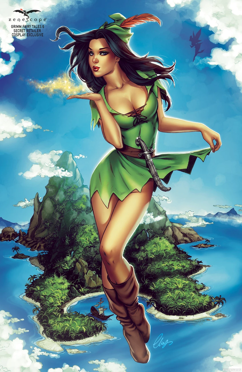 Tinker Bell from the Peter Pan series. She is depicted in mid-air with her arms outstretched as if she's flying. In the background, there are floating islands and clouds, suggesting a whimsical or