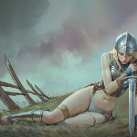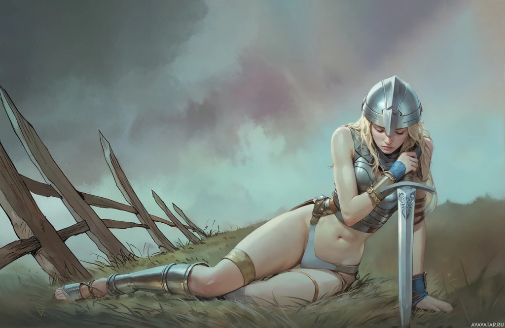 blonde hair, who appears to be resting or contemplating. She is wearing what seems to be ancient warrior attire, including a breastplate, a skirt, and
