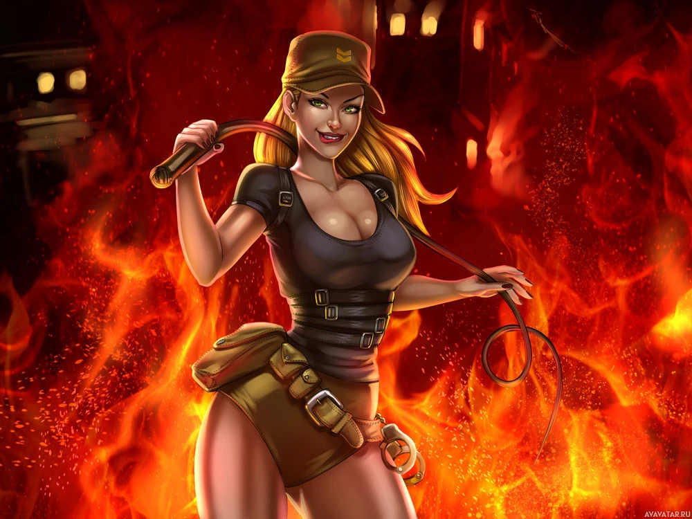 a female character who appears to be in a setting with fire around her. She is holding what looks like a weapon and has