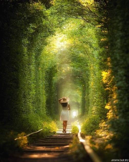 The image shows a woman walking down what appears to be a path or trail through a lush, green tunnel. She is from behind and is wearing a hat, which suggests it might be sunny out. The