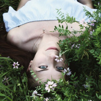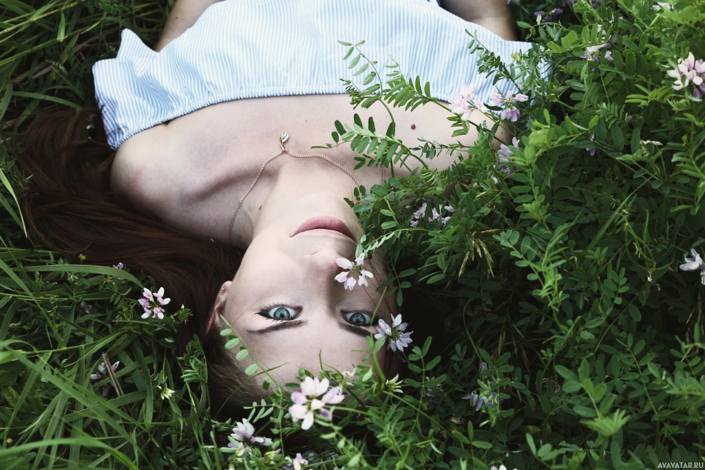 The image depicts a person lying on their back in the grass with wildflowers around them. The individual appears to be wearing a sleeveless top, and there is a peaceful and relaxed atmosphere to the scene. It's a pleasant outdoor setting that suggests a sense of tranquility or rest.