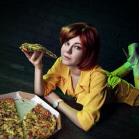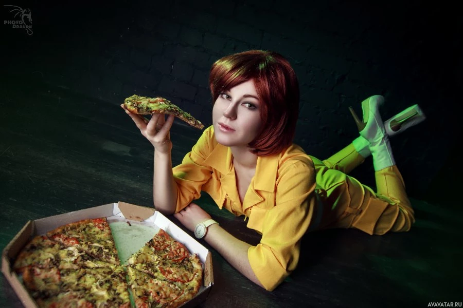 a pizza box towards the camera. They are wearing yellow clothing that appears to be a suit or jumpsuit, and they have short