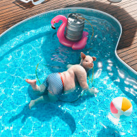 a swimming pool filled with water. There are inflatable beach balls and a flamingo toy on the pool deck, suggesting a leisure or
