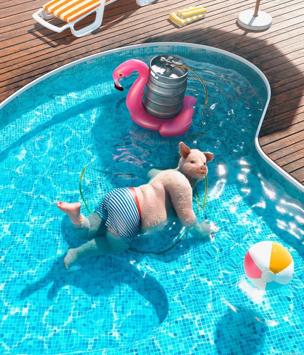 playful setting. The pig appears relaxed and is partially submerged in the water. The overall atmosphere of the picture is whimsical and amusing due to the unexpected sight of an animal, typically not associated with