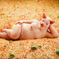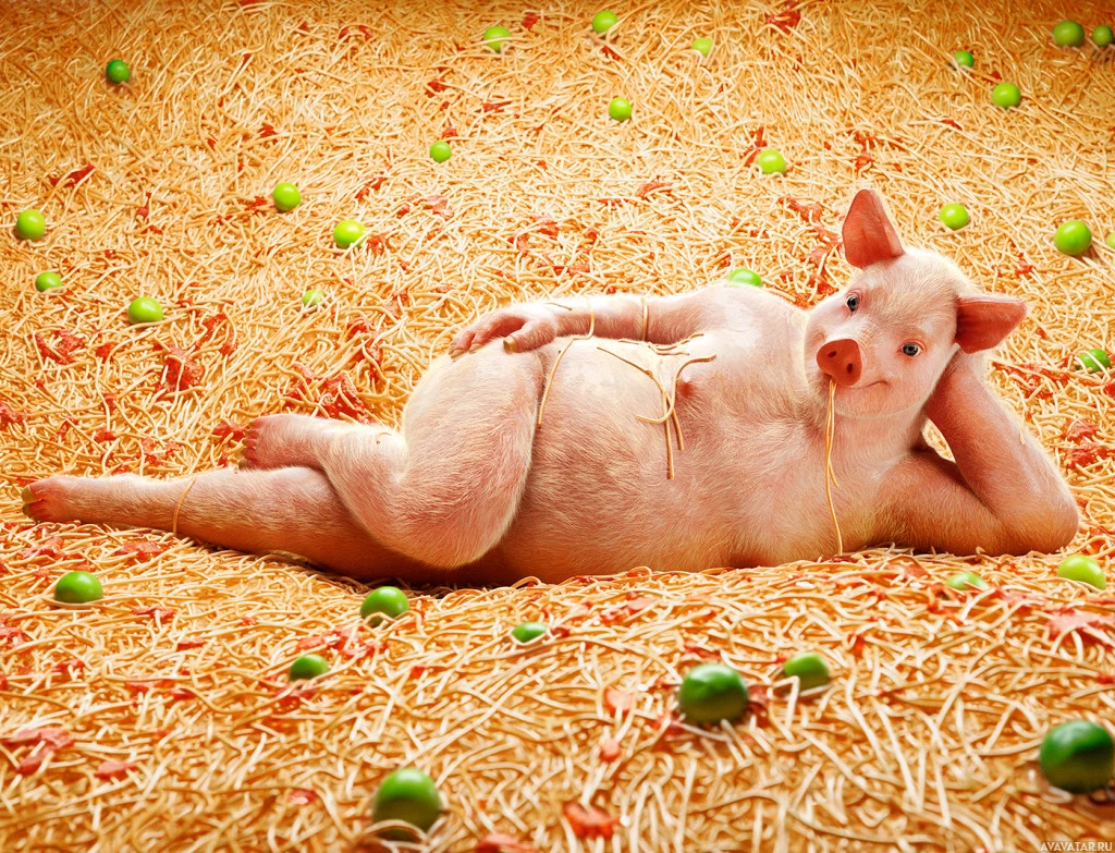 The image features a pig lying down in what appears to be a bed of corn or grains. The pig is wearing human clothes and has its legs crossed in