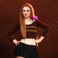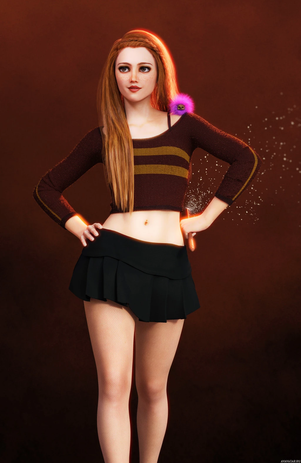 a black skirt and a brown cardigan, and she has her hands on her hips. There is a magical or mystical element to the picture, as suggested by the sparkles around her feet. The background is a gradient from