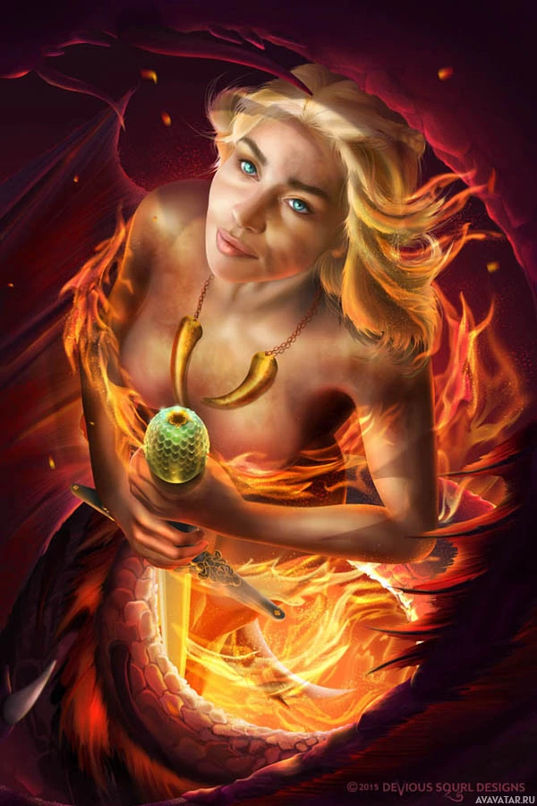 Daenerys Targaryen from the television series "Game of Thrones." She is shown with her hair blowing in the wind, holding what appears to be