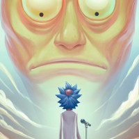 ominous cloud looms in the background. The artwork has been done in a style that is consistent with the show's animation, and it captures Rick's