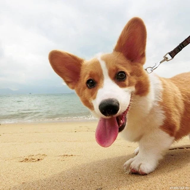 На картинке изображена собака на пляже. Собака является породой корги и имеет характерные длинные уши и короткую морду. Кажется, он наслаждается, поскольку стоит в песке возле береговой линии с водой, видимой на заднем плане.