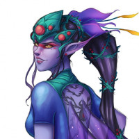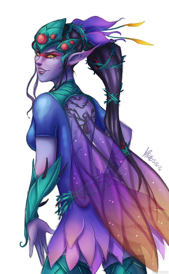 mechanical wings and distinctive purple and black color scheme. She's a cyborg assassin with a deadly aim and is one of