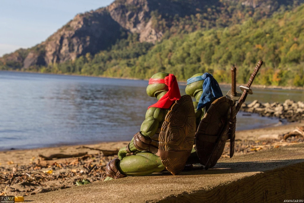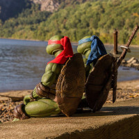 a body of water, which appears to be a lake or a river. One figure is dressed in green and the other in red, with each wearing their respective color masks and carrying weapons that resemble sais. These characters are known as Leonardo and Raphael from the Teenage